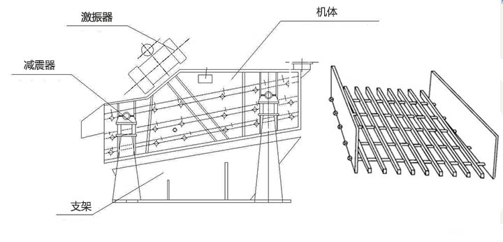 棒條篩工作時,由激振器產生的激振力通過篩箱傳遞給篩箱內的篩面上,因激振器產生激振動力為縱向力,迫使篩箱帶動篩網面作縱向前后位移。在一定條件下,篩網面上的物料因受激振力作用而被向前拋起,落下時小于篩孔的物料則透篩而落到下層,物料在篩網面上的運動軌跡為拋物運動,由于這樣周而復始的物料運動,從而完成物料篩分作業。